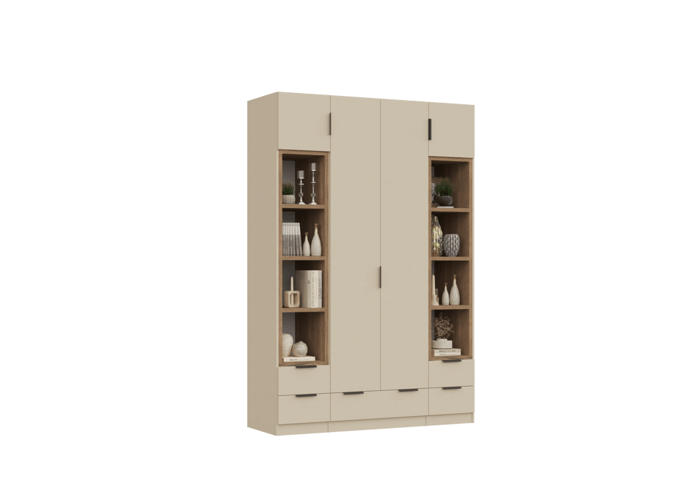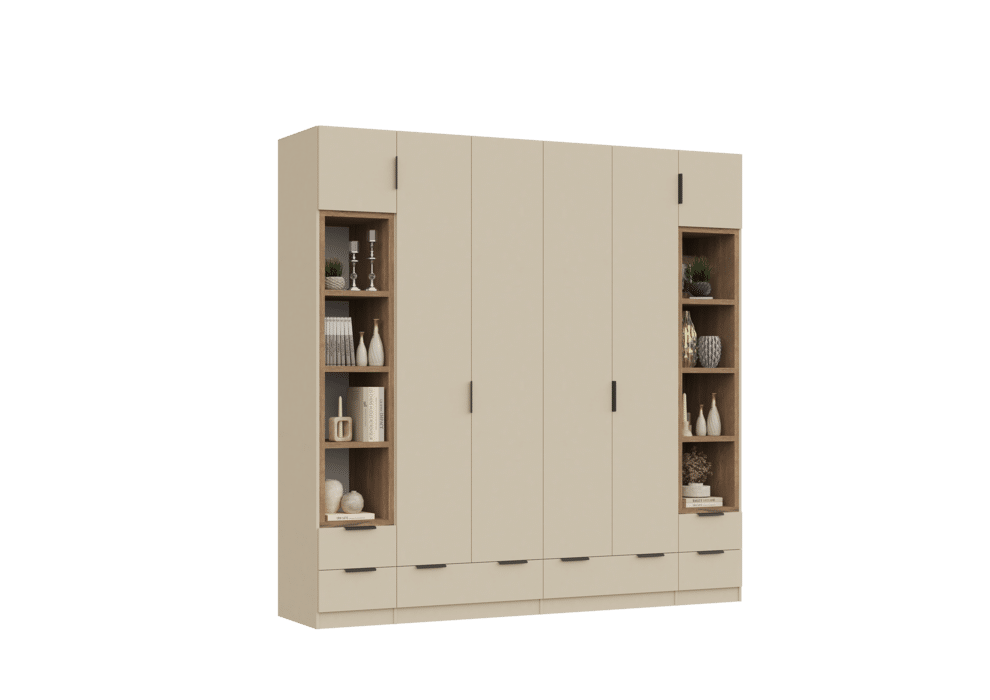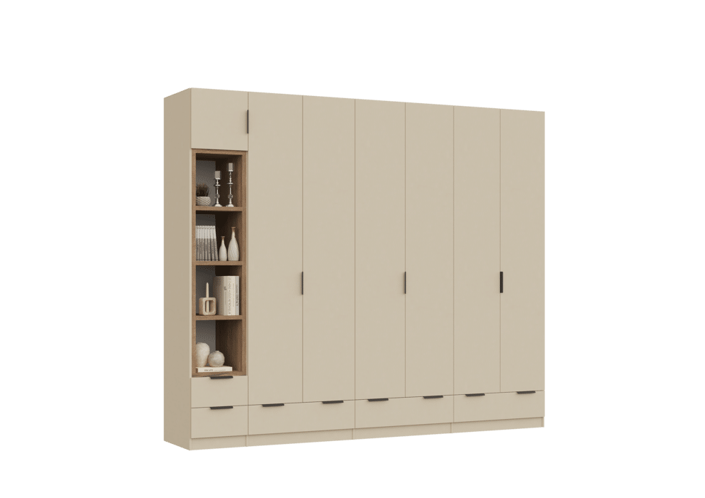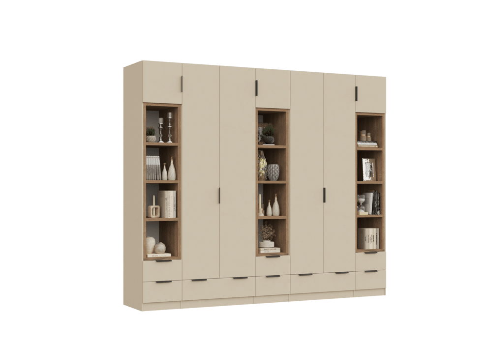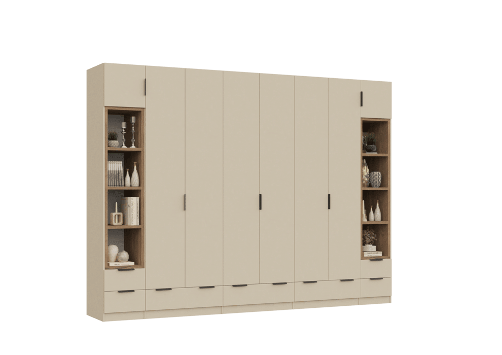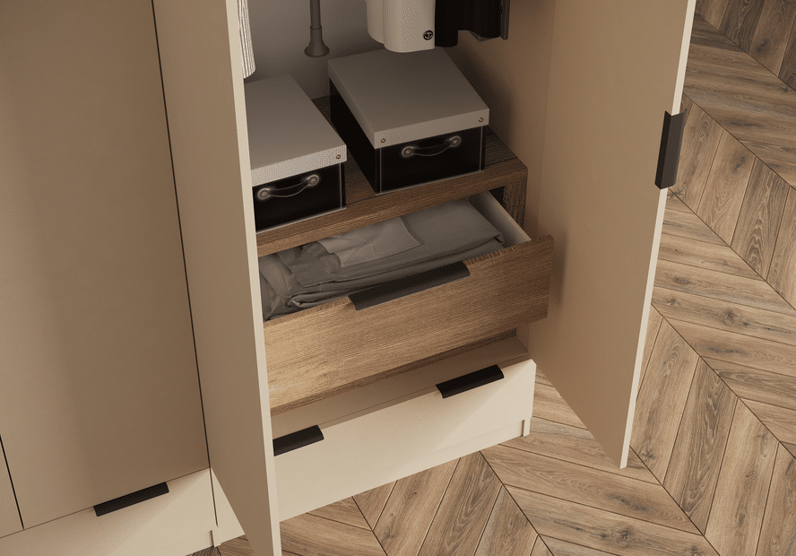 ארון בעיצוב מודרני ונקי, מיוצר בהתאמה אישית ממלמין יצוק איכותי ועמיד. חזית אלגנטית בקווים ישרים המעניקה מראה יוקרתי ומסודר לכל חלל. הארון מיוצר לפי מידה, וניתן לבחור את התכנון הפנימי – מדפים, מגירות ואזורי תלייה – באמצעות יצירת קשר עם החנות, להתאמה מושלמת לצרכים שלכם.