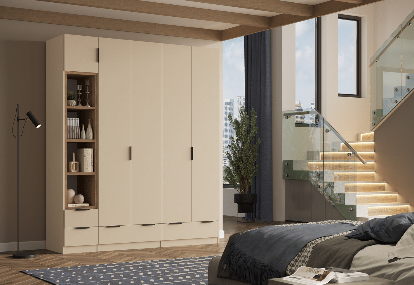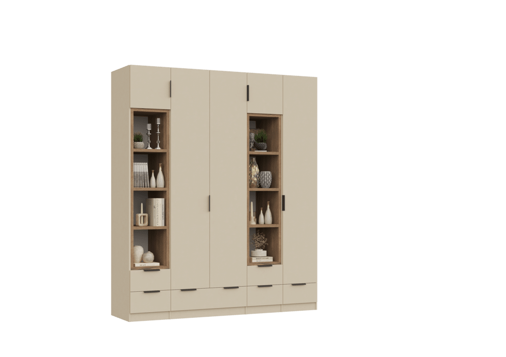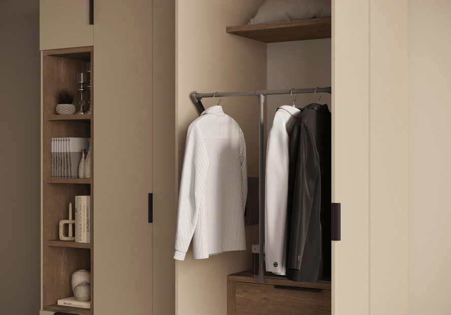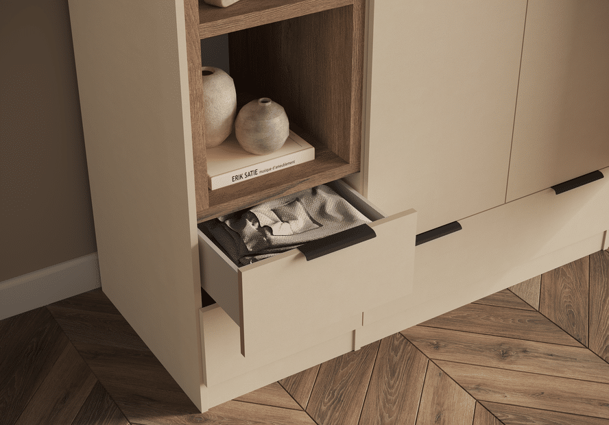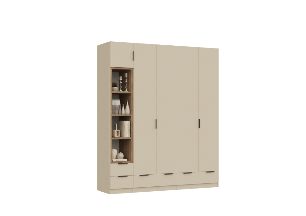 ארון בעיצוב מודרני ונקי, מיוצר בהתאמה אישית ממלמין יצוק איכותי ועמיד. חזית אלגנטית בקווים ישרים המעניקה מראה יוקרתי ומסודר לכל חלל. הארון מיוצר לפי מידה, וניתן לבחור את התכנון הפנימי – מדפים, מגירות ואזורי תלייה – באמצעות יצירת קשר עם החנות, להתאמה מושלמת לצרכים שלכם.