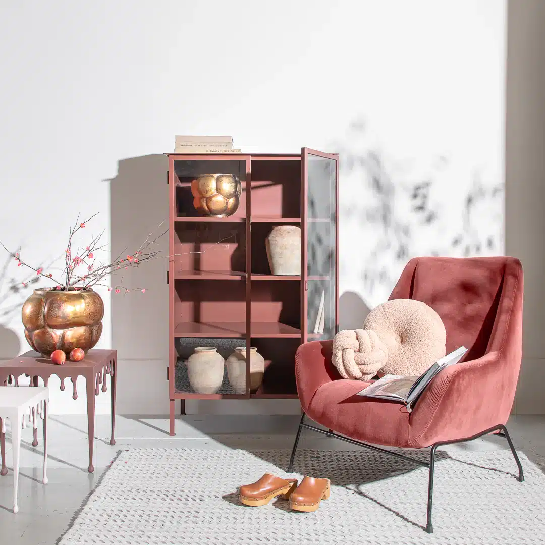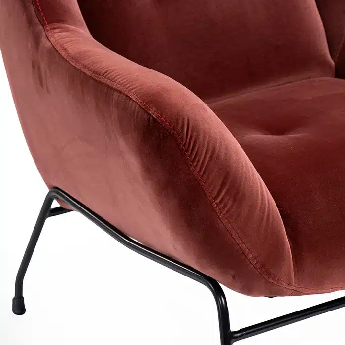 כורסה אלגנטית ונוחה בעיצוב מודרני, מרופדת בספוג איכותי ומעוטרת בבד בורדו, עם רגליים ממתכת איכותית.