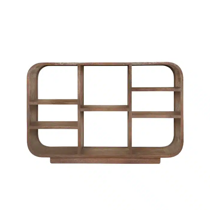 יחידת מידוף מעץ מנגו בגוון עץ טבעי. כוננית מדפים רוחבית בעיצוב ייחודי עם שמונה חללי תצוגה בגבהים משתנים. רהיט מושלם לשילוב בחדר עבודה, ספרייה, חלל מגורים מרכזי או מבואת כניסה, המוסיף טאץ’ חמים ואלגנטי לכל חלל.