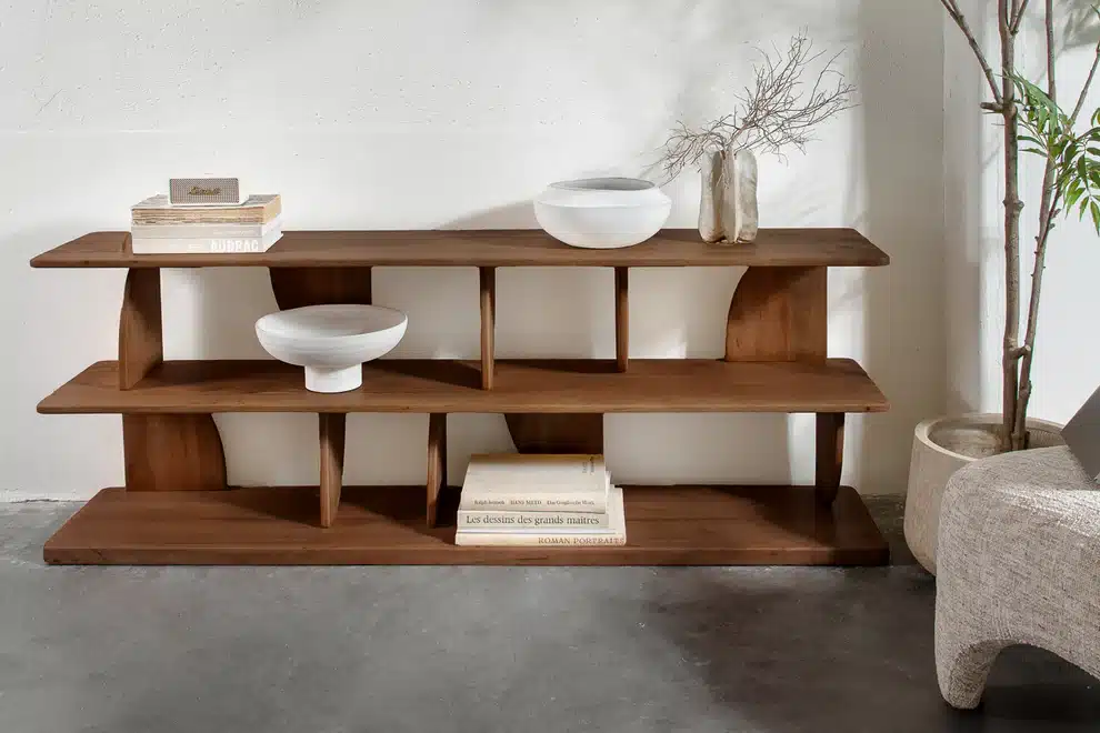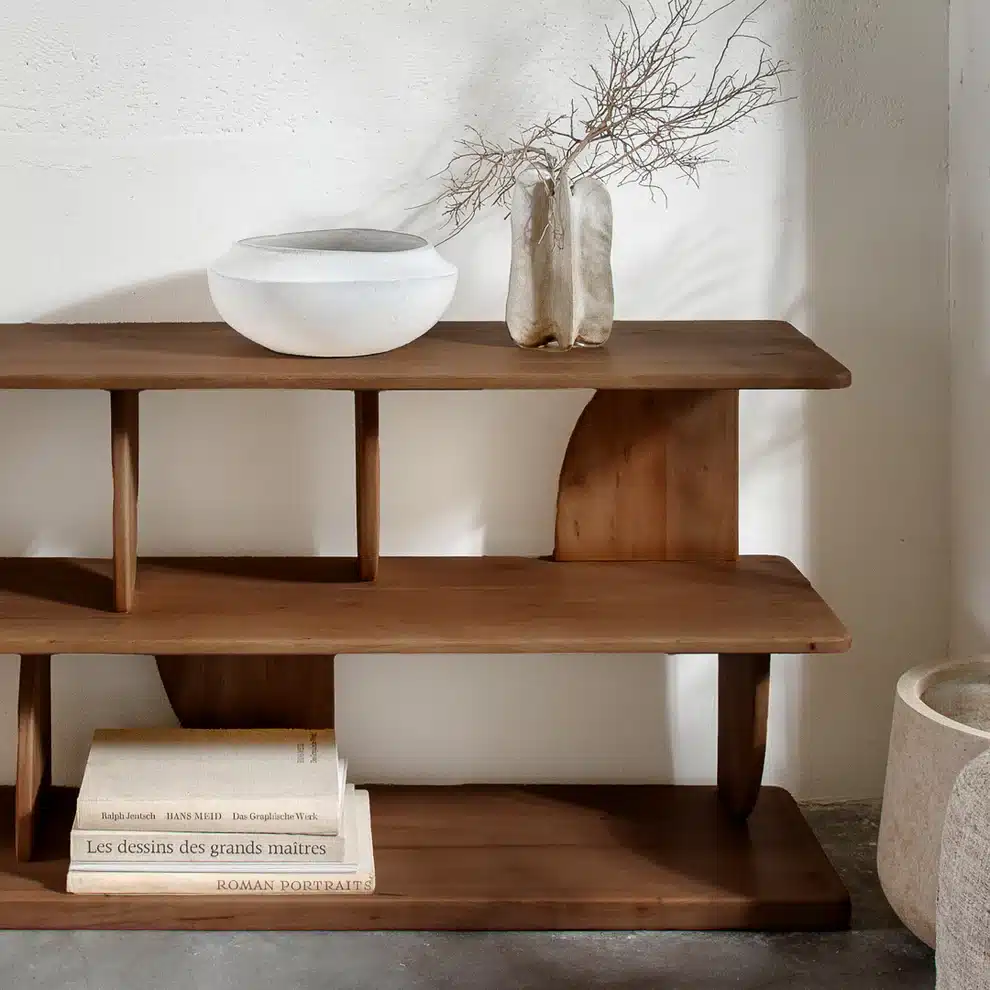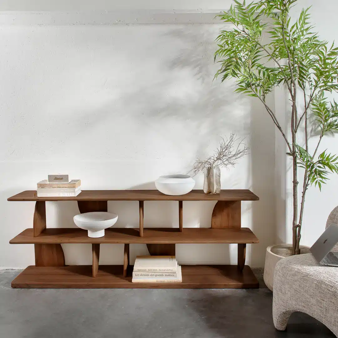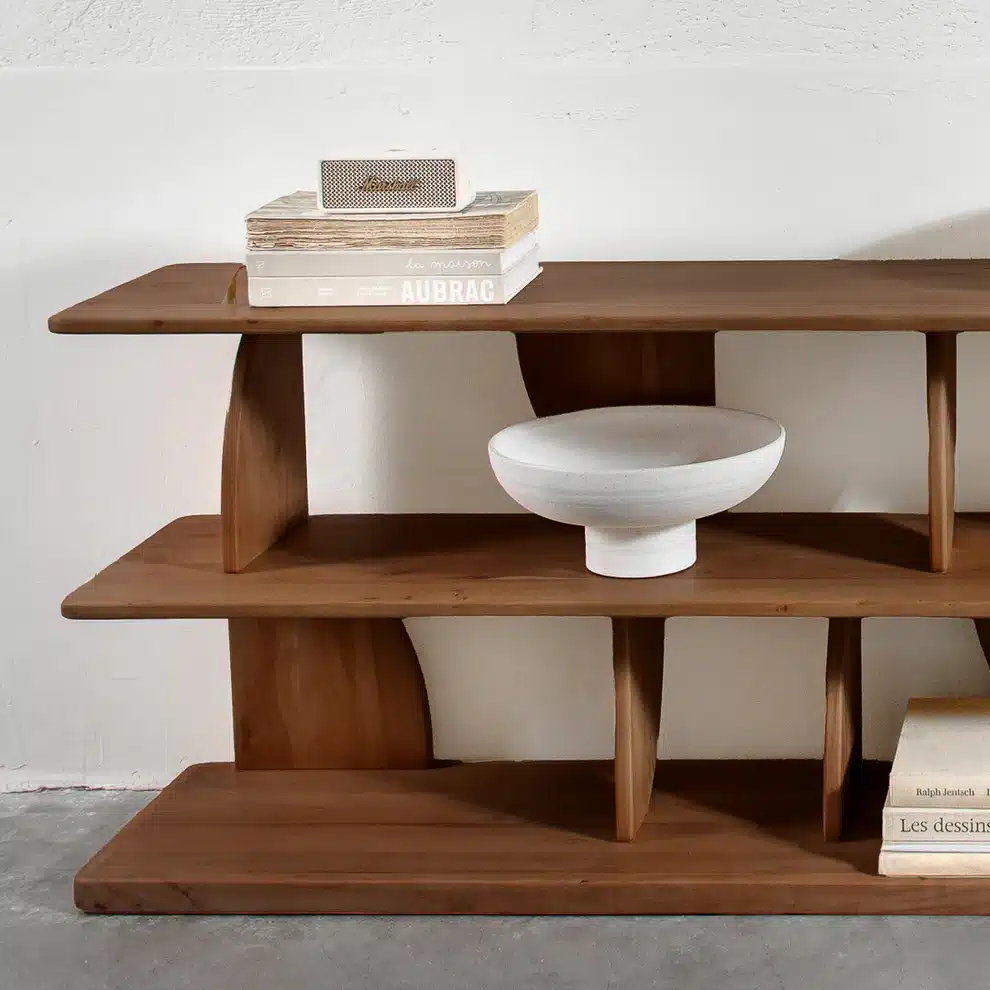 מדפים ליב בגוון עץ כהה. יחידת מידוף דו‑שלבית בעיצוב גיאומטרי, עם צלעות מפרש זוויתיות היוצרות משחק אור וצל מרשים. יחידת מידוף עומדת לרצפה, המשלבת פונקציונליות עם מראה מודרני וייחודי.