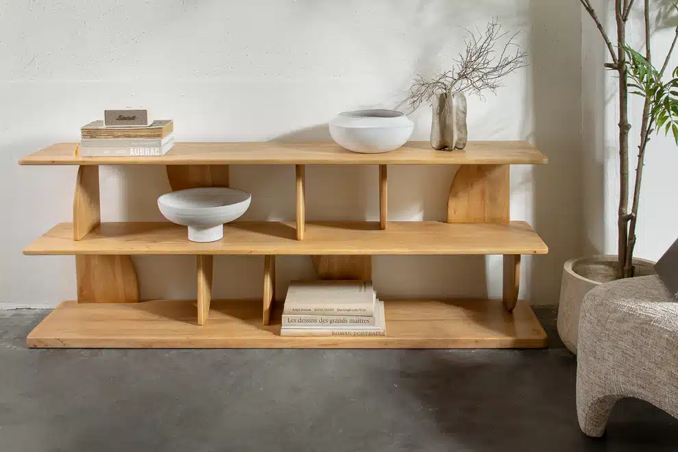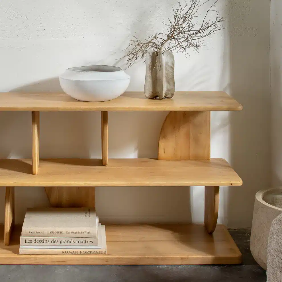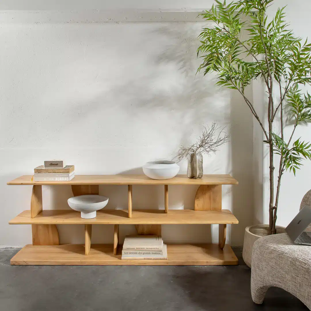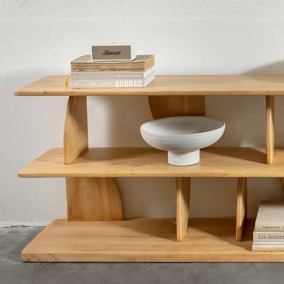 מדפים ליב בגוון עץ טבעי. יחידת מידוף דו‑שלבית בעיצוב גיאומטרי, עם צלעות מפרש זוויתיות היוצרות משחק אור וצל ייחודי. יחידת מידוף עומדת לרצפה, המשלבת פונקציונליות עם מראה מודרני ומעניין.