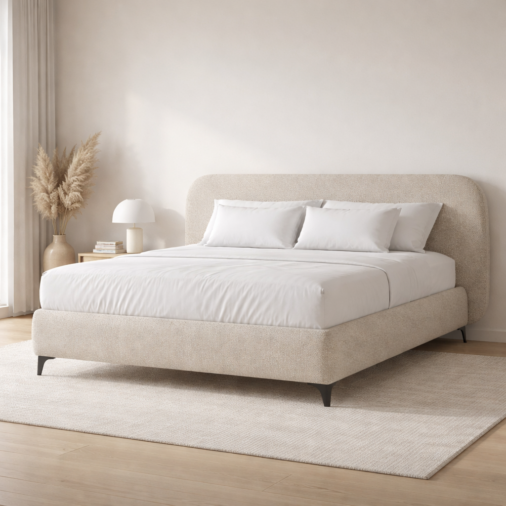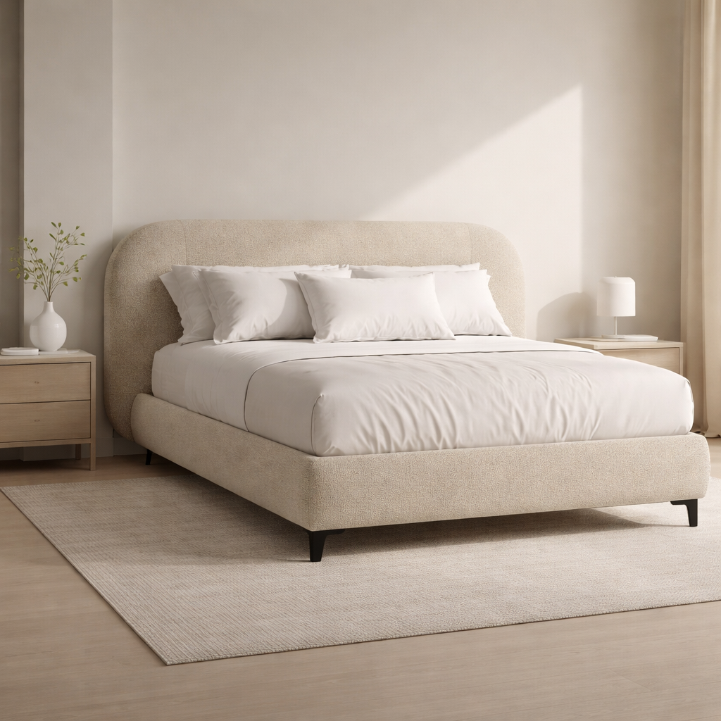 הקווים המעוגלים והרכים של המיטה יוצרים ניגודיות מושלמת ומעניינת לרגלי המתכת השחורות והדקיקות, מה שמעניק לחדר מראה מודרני, חמים ומלא באופי.