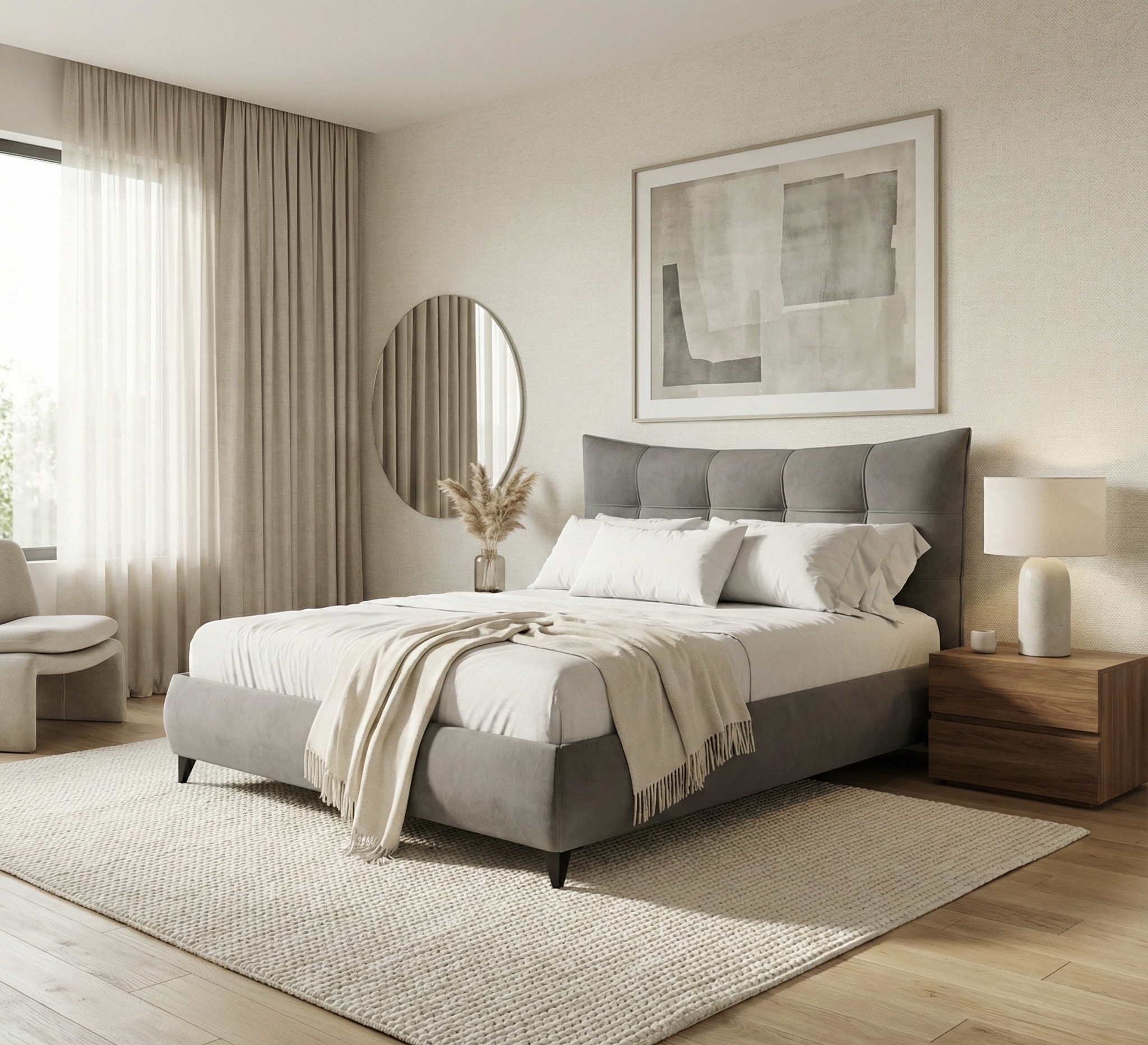דגם מילר מביא תחכום גיאומטרי לחדר השינה, עם ראש מיטה בגימור ריבועים רחבים וצורה קעורה מעט ש"מחבקת" את החלל. גוון האפור הכהה והעמוק מוסיף טאץ' דרמטי ובוגר, שמשתלב מעולה עם רגלי המתכת השחורות למראה אורבני ומוקפד. זו הבחירה לאלו שמחפשים עיצוב נקי, ארכיטקטוני ועל-זמני שישדרג כל קיר בחדר.
