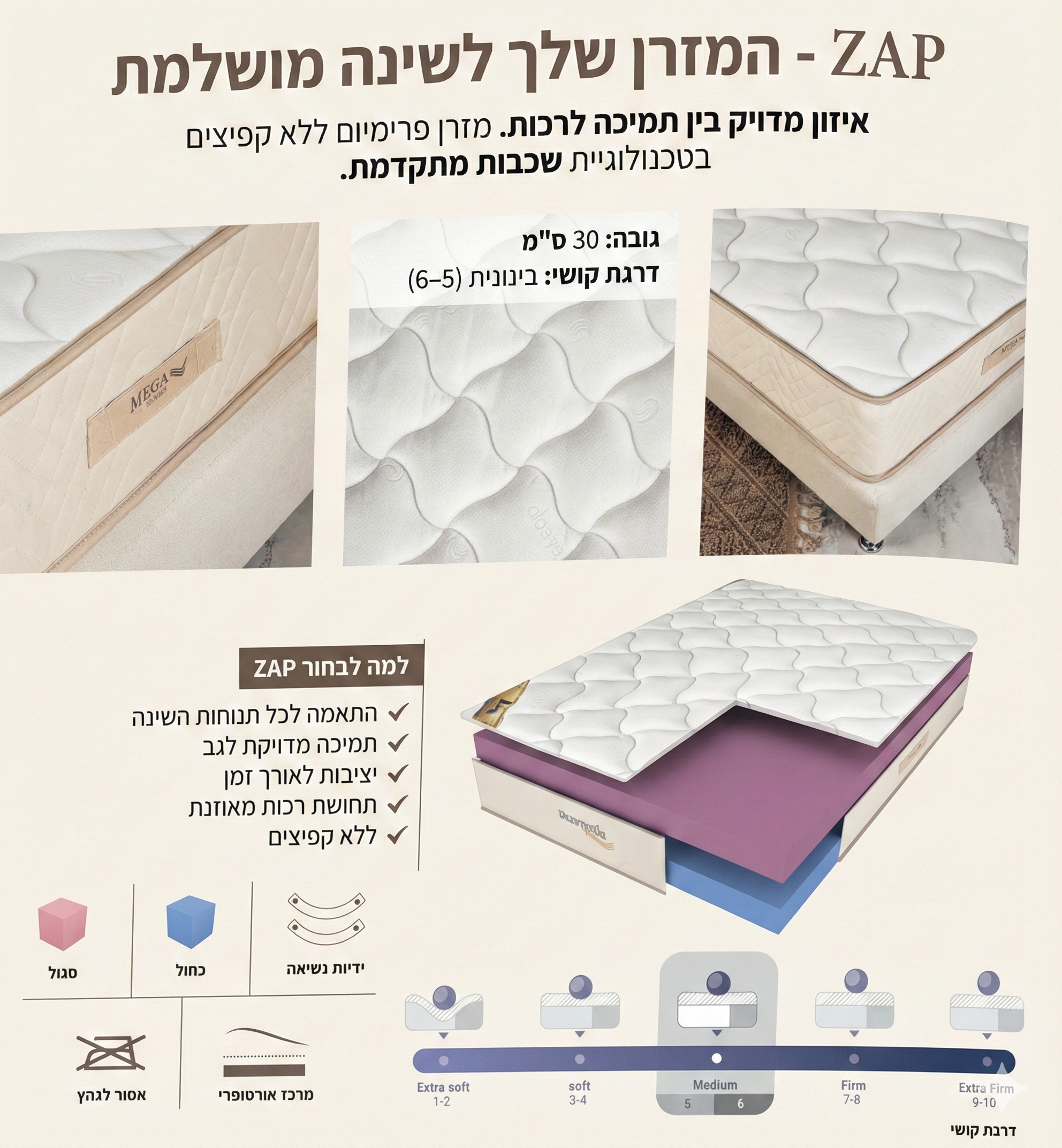 כולל מזרן איכותי “זאפ” מבית מגה פולימרים (שווי מזרן: כ-1,300 ₪)