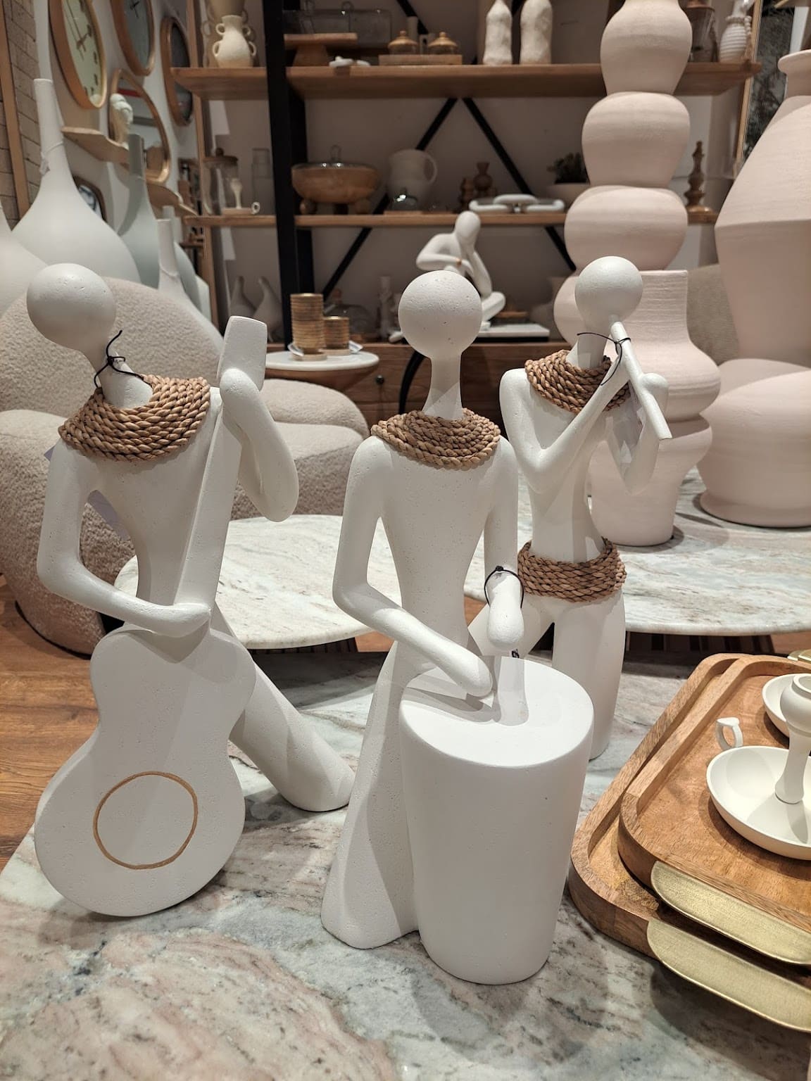 דמות דקורטיבית מנגנת בצ׳לו, בעיצוב אבסטרקטי מודרני שמשלב אבן וולקנית לבנה עם פרטי קליעת Abaca טבעית.