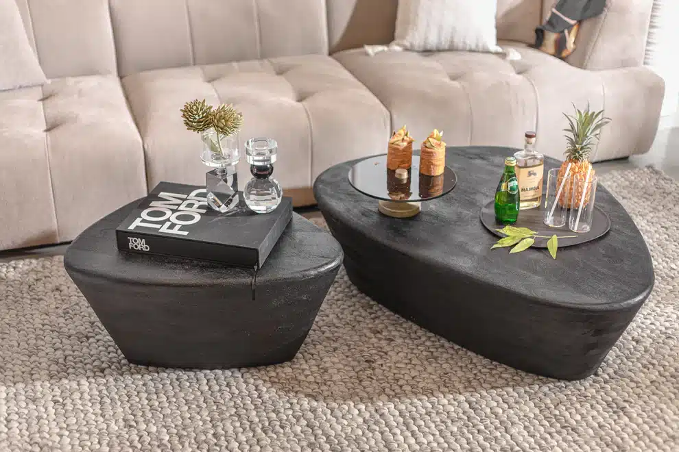 שולחן עץ מנגו אורגני פרופיל אמורפי בצבע שחור. שולחן סלון מעוצב מעץ גושני מקשה אחת, בעל פרופיל אמורפי ייחודי ונראות אותנטית־עכשווית. פריט PIECE שמוסיף עומק, דרמה ויוקרה טבעית לכל חלל.
