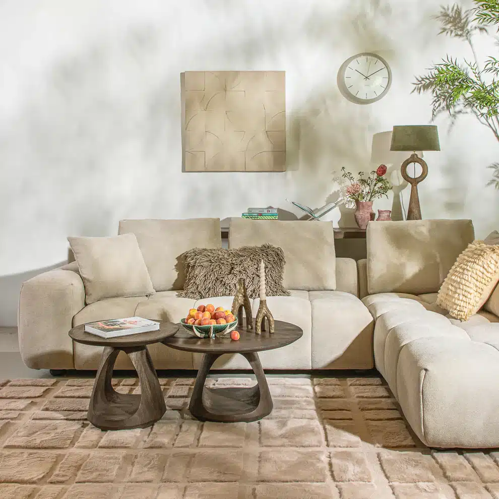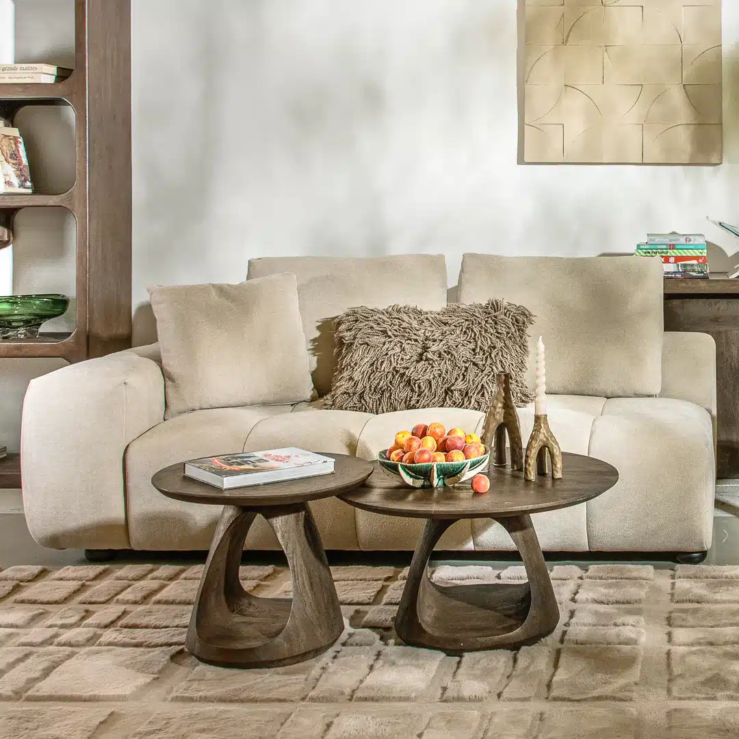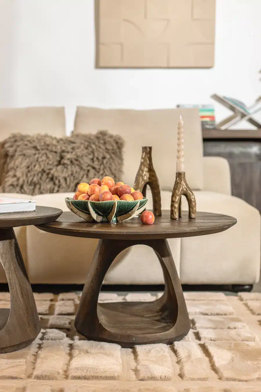 שולחן בוקס ליבינג בגוון עץ כהה מציע לחלל סלון מראה מרשים עם אמירה עיצובית ברורה. הפלטה העגולה נשענת על רגל עץ גושנית אמורפית, שיוצרת נוכחות חזקה וייחודית. שולחן זה הוא חלק מסדרת "בוקס ליבינג", שמביאה שלמות וסטייל לחלל.