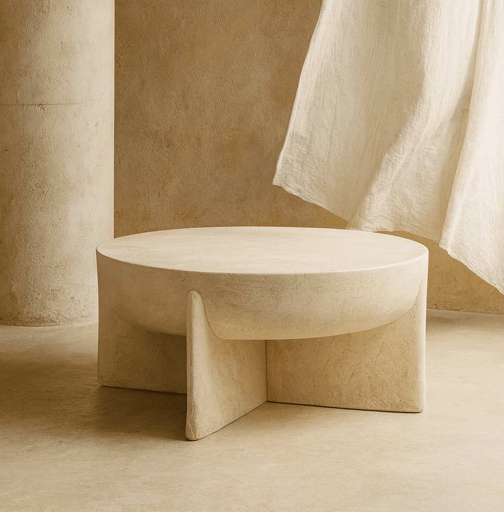 שולחן סלון עגול ומרשים, עם בסיס אמנותי המדגיש מראה דמוי האבן הגולמית.