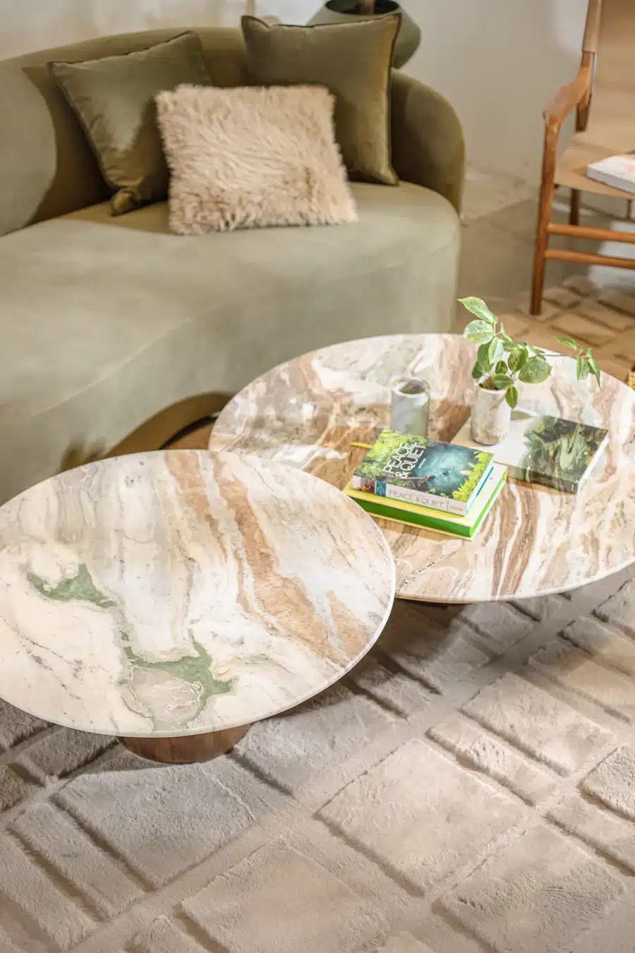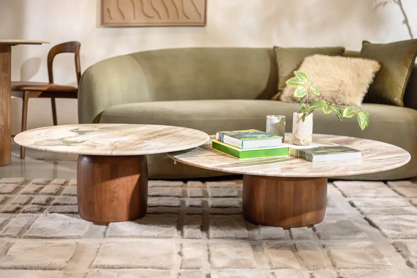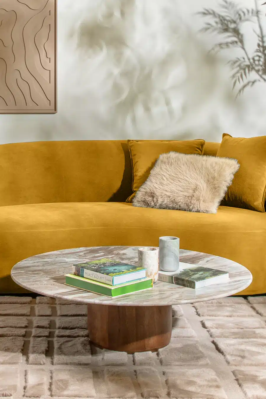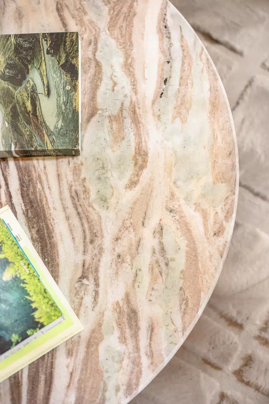 שולחן קוזי מארבל בדפוס מחצב בהיר מוסיף לחלל מראה אלגנטי ומרשים. הפלטה העגולה מעניקה תחושת יוקרה טבעית, ורגל העץ העבה יוצרת עיצוב יציב ומרשים. שולחן מרכזי אידיאלי לחלל המגורים, שמשלב נוכחות עדינה עם חמימות וסטייל מודרני.