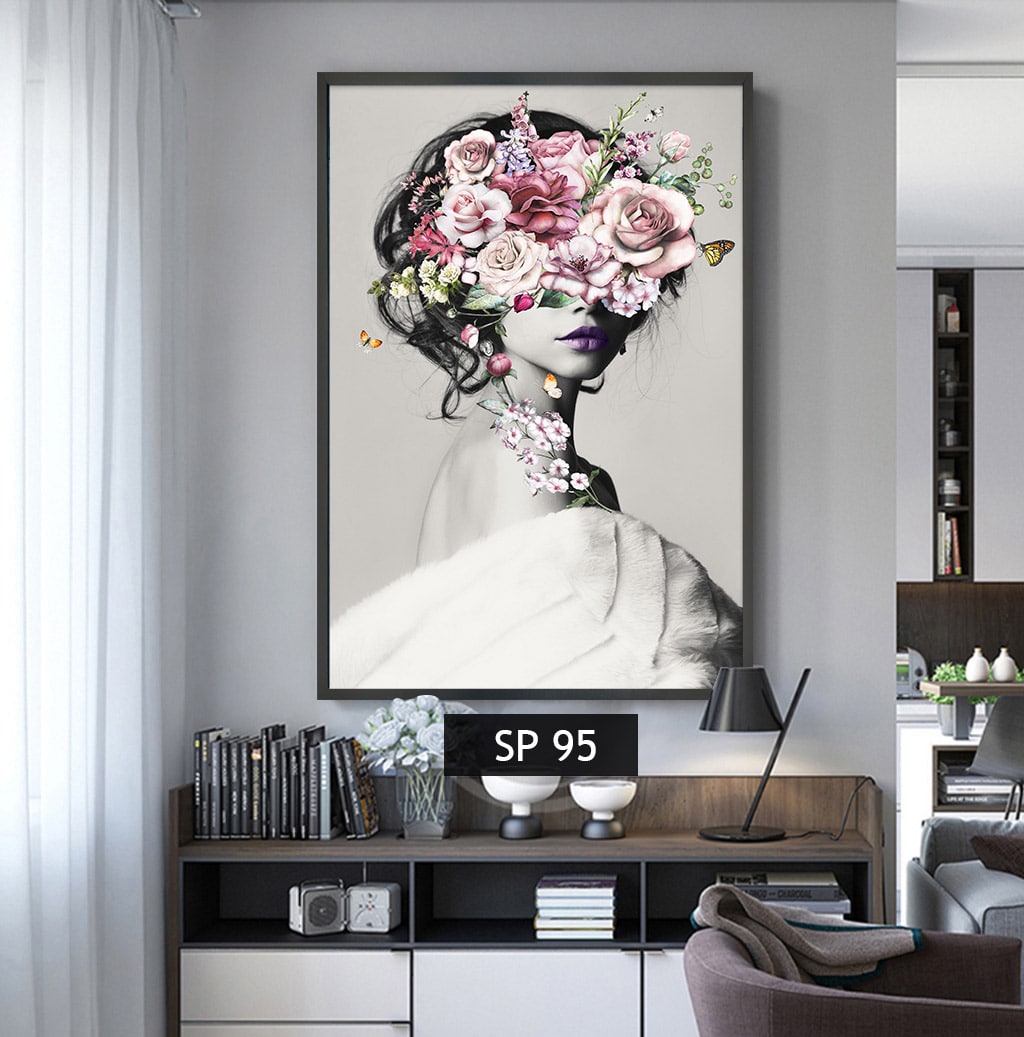 תמונת קנבס אישה בשחור לבן עם פרחים ורודים SP 95