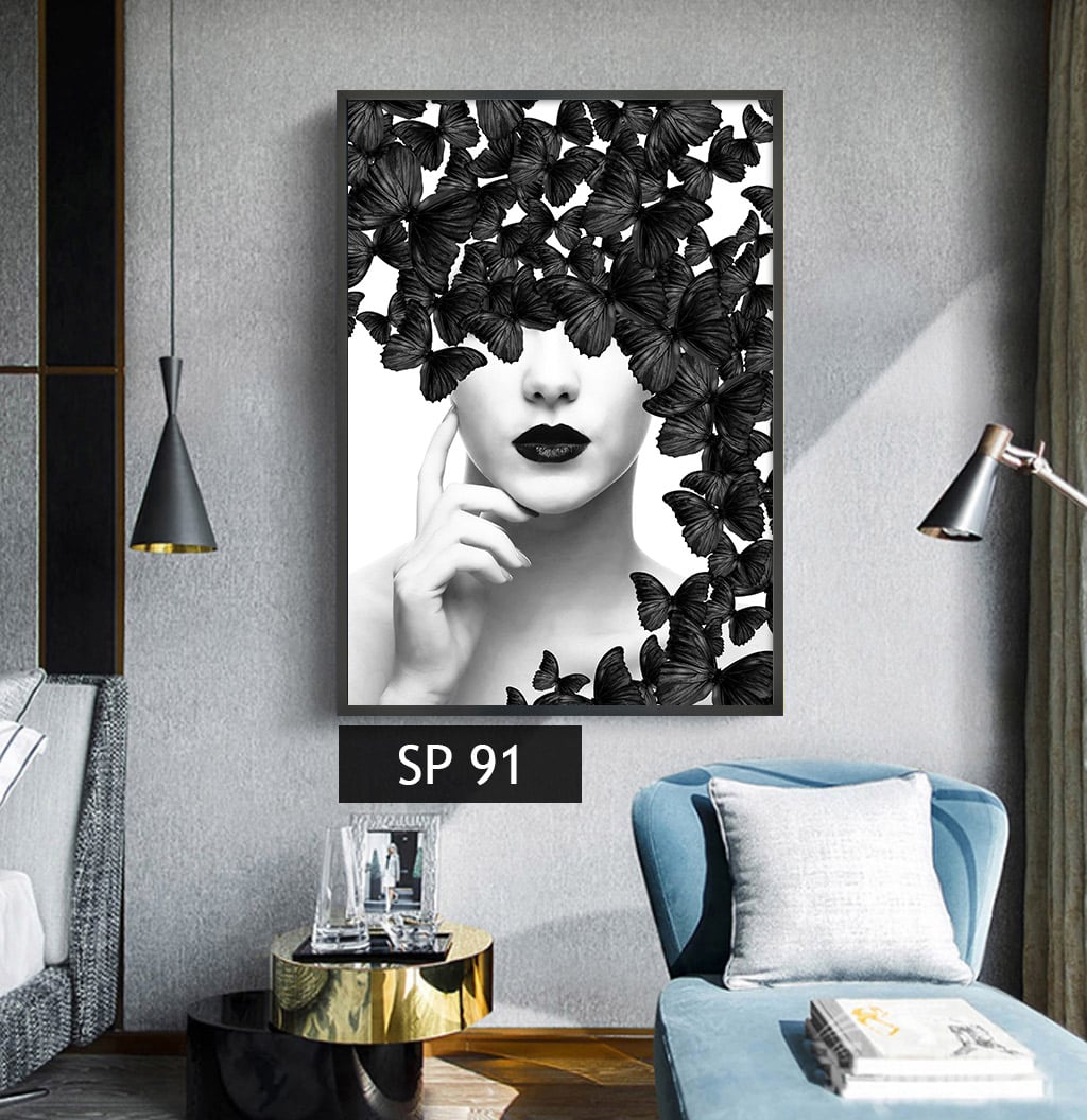 תמונת קנבס אישה עם פרפרים בשחור לבן SP 91